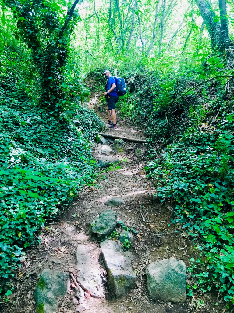 Summary: Richard and I both began this day tired. We were grateful for the gentle trail, with minimal climbs, generous periods of shade, and cool breezes. Despite our exhaustion, we did not miss the unique beauty of this particular path. The “jungle like trek” just outside of San Lorenzo Nuovo was absolutely stunning. And the large and lovely Lake Bolsena? Well, she simply flirted with us for over an hour, luring us into her city limits.
