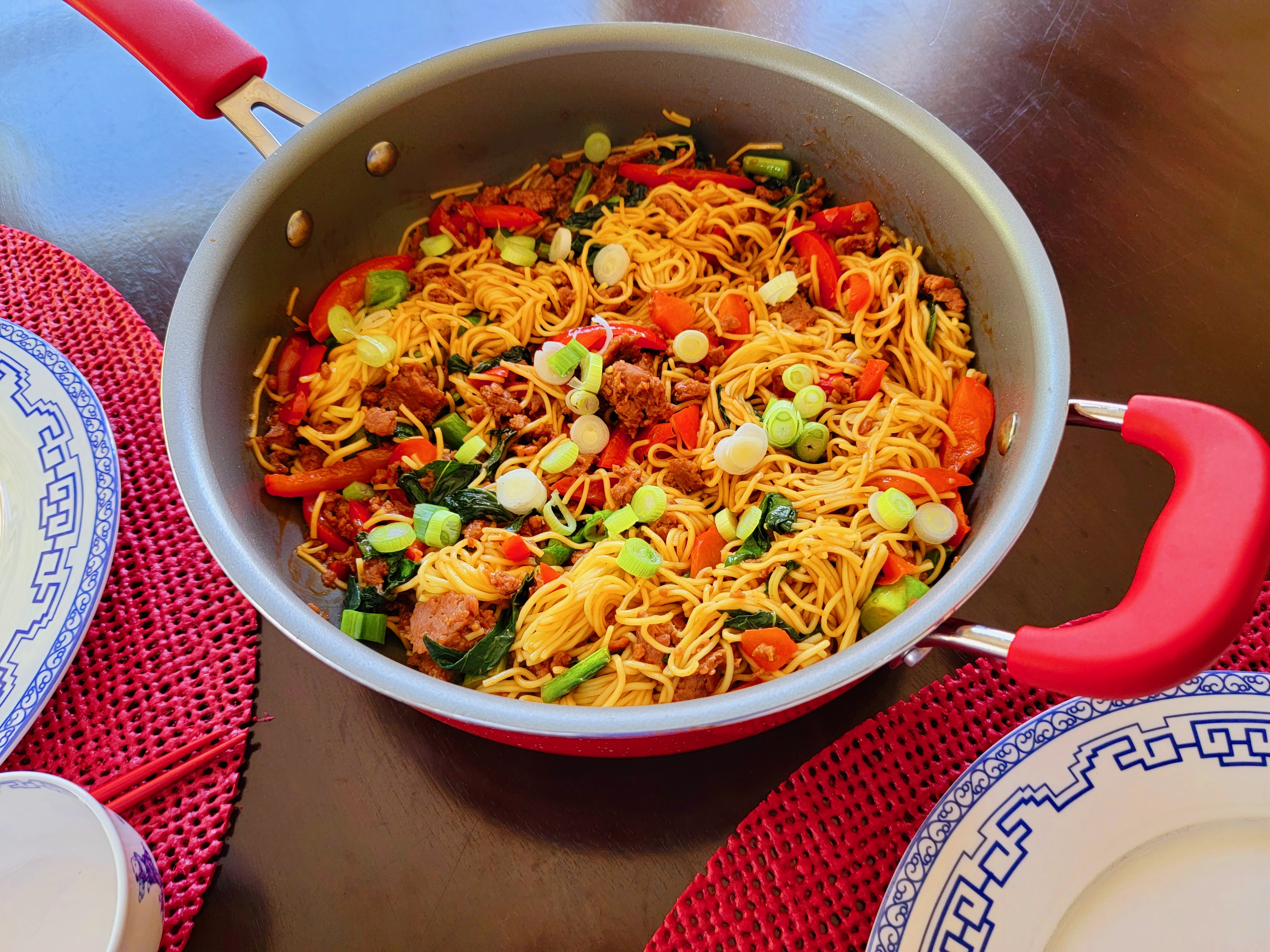 Not to divulge any trade secrets, here is a similar recipe to the HF Cantonese Noodles. Just substitute chow mein noodles for the spaghetti and vegetarian crumbles for the ground beef, and you’re golden!