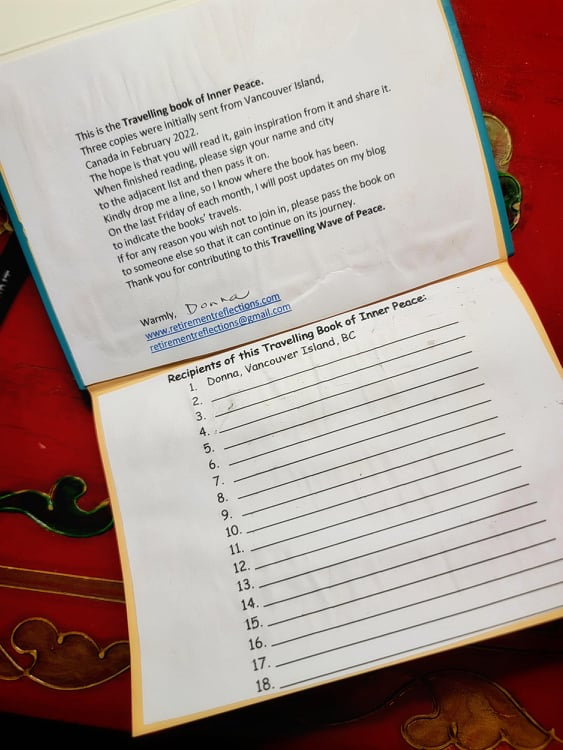 “This is the Travelling Book of Inner Peace. Three copies were initially sent from Vancouver Island, Canada, in February 2022. The hope is that you will read it, gain inspiration, and share it. When finished reading, please sign your name and city to the adjacent list and then pass it on. Kindly drop me a line, so I know where the book has been. On the last Friday of each month, I will post updates on my blog to indicate the books’ travels. If for any reason you wish not to join in, please pass the book on to someone else so that it can continue on its journey. Thank you for contributing to this Travelling Wave of Peace.“