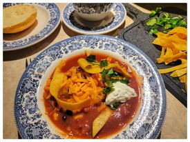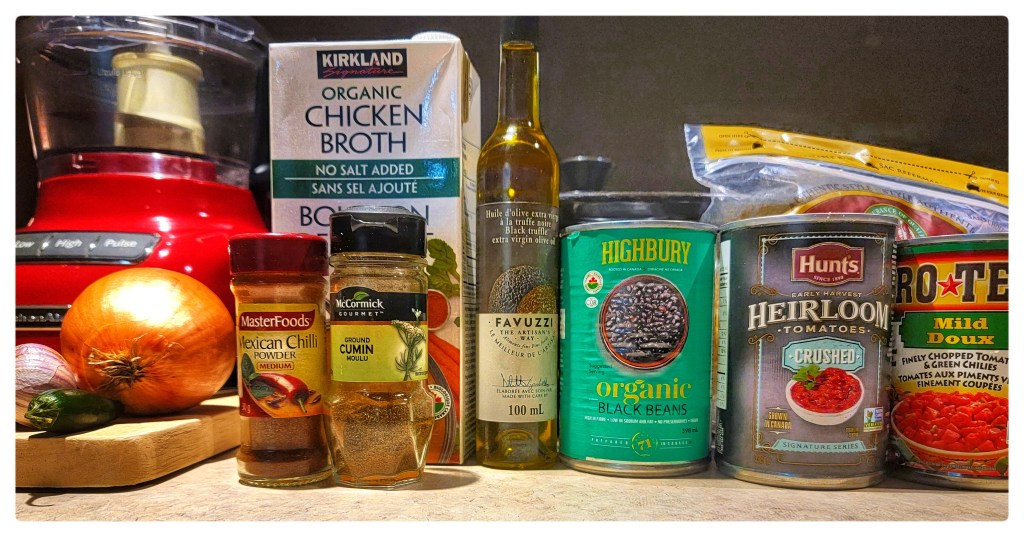 Both recipes call for these basic ingredients: Chicken Broth, Canned Black Beans, Canned/Frozen Corn, Diced Jalapenos/Chilies, Onion, Garlic, Cumin, Chili Powder, Cooked or Uncooked Boneless, Skinless Chicken Breasts and Corn Tortillas. Optional Toppings: Cilantro, Shredded Cheese, Sour Cream.