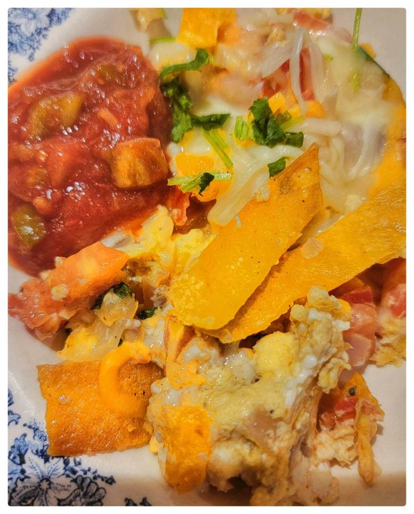 Why not try this Corn Tortilla and Egg Scramble? It will use your extra tortillas, peppers, tomatoes, onion, garlic, cilantro and shredded cheese. And if you sneak in some black beans – I promise not to tell.