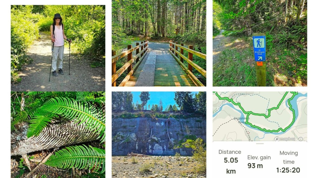 My favourite here in the Comox Valley is the Comox Dam which runs along the Puntlage River, you can walk all the way to Nymphs Falls, ( but I haven’t), there is lots of shade and not too much elevation. You can also swim there!