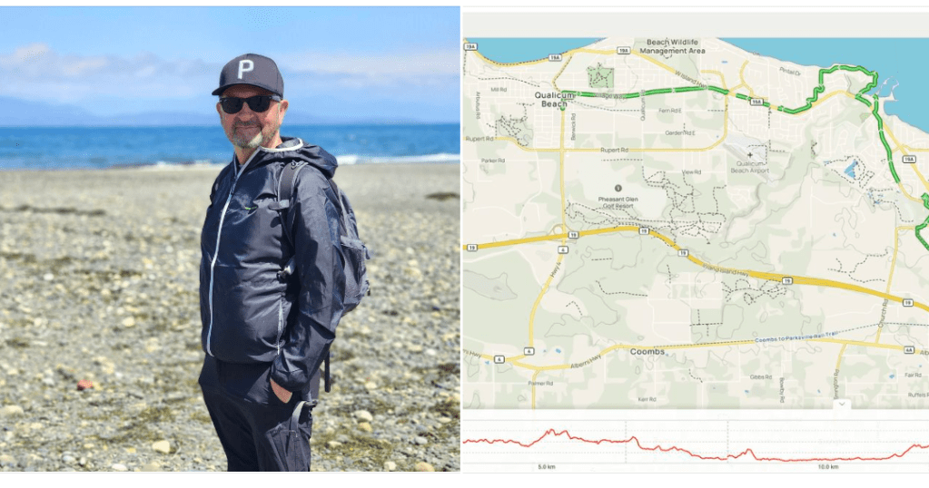 1. Parksville to Qualicum Beach, 16 km, flat hike, mixed terrain. We ate lunch at the newly renamed French Creek Social Hall. To make this hike more interesting, we walked to Qualicum Beach and took the bus back home.