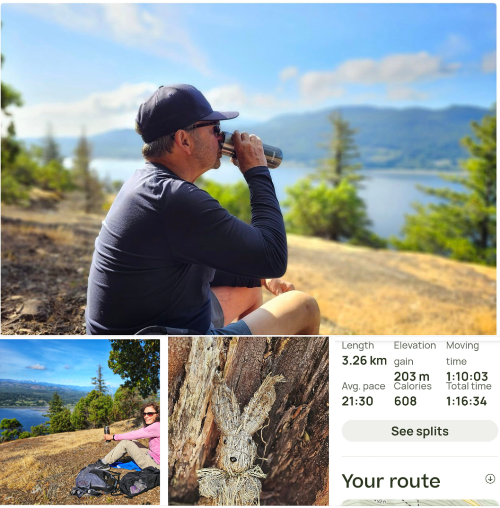 Pictures of Vancouver Island & particularly the Nanaimo area always stir the embers. One of my friends’ daughter worked at Cuckoo’s Restaurant. When I visit friends who live on the island It’s like going to another country from landlocked Alberta. I haven’t been doing any hiking but there’ve been lots of steps gardening. Five inches of rain perked up everything. I feel like we’ve had summer with the heat in June. I have to remind myself that it’s just beginning. A visit to Metis Crossing on the North Saskatchewan River west of home was a highlight this month as well as the Beaumont Blues & Roots music festival where my friends’ daughter & her band performed. And guess what? It rained both days.