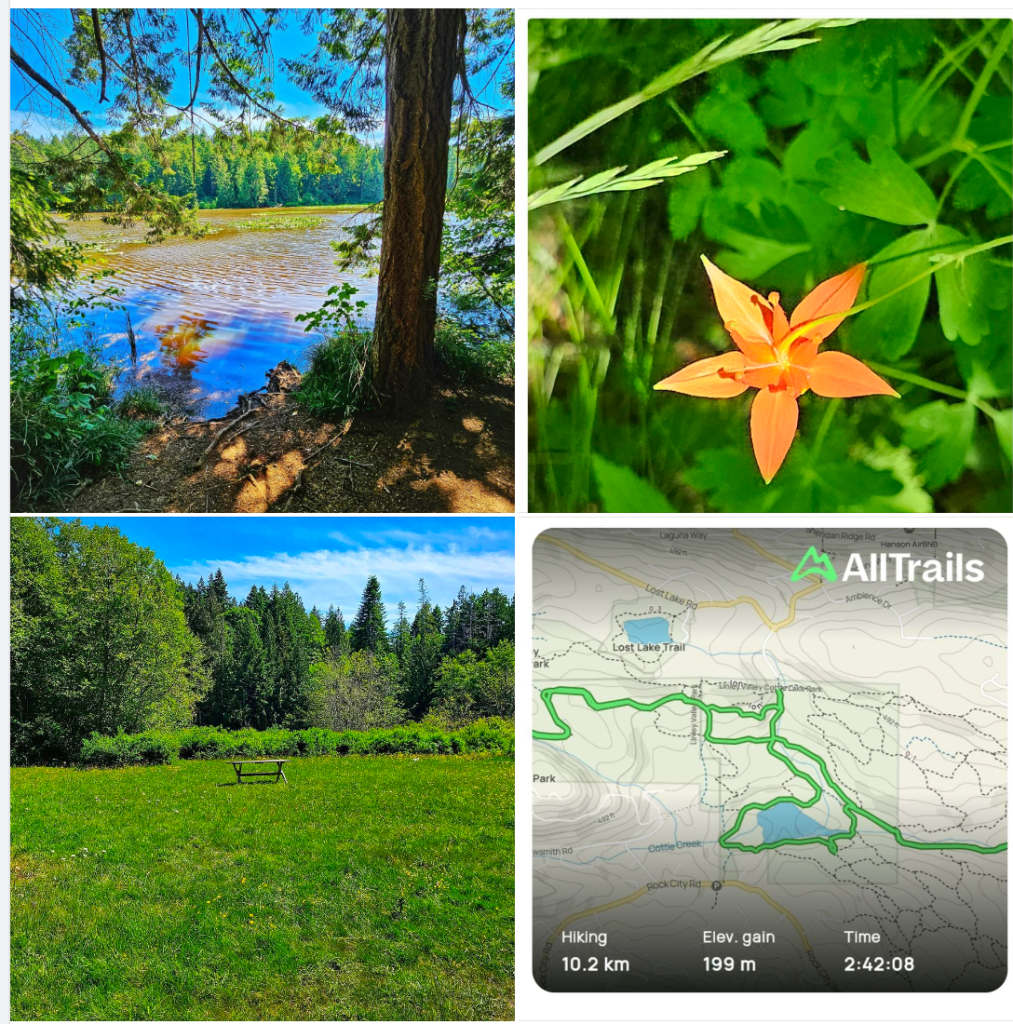 Now we have more hikes to enjoy when we arrive the end of July. I especially enjoyed the Englishman River hike last summer, and we did Westwood Lake twice during the month we were in Nanaimo. We did the Linley Valley/Cottle Lake hike and lost the trail and ended up climbing up a large rock outcropping.