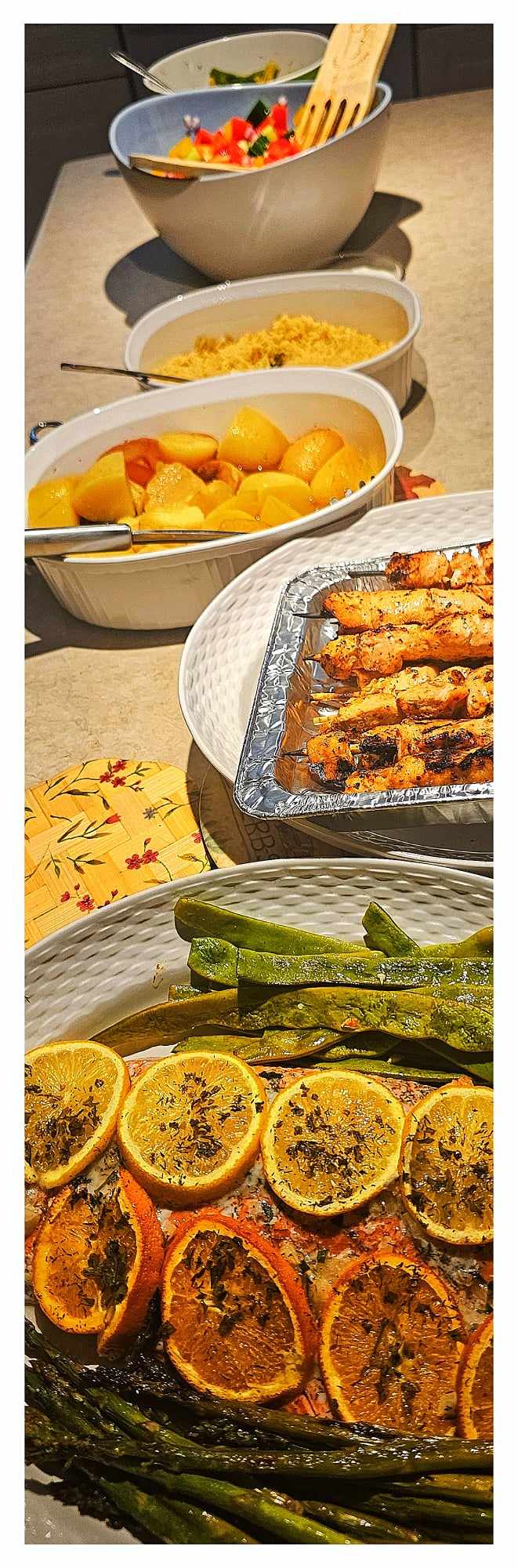 Last week, I wrote about my recent get-together with friends I met through blogging. For one of these meetups, Richard and I invited the full gang (10 in total) over to our house for dinner. We were initially going to go with just Richard’s signature dish (souvlaki chicken skewers, Greek salad, Greek rice pilaf and lemony potatoes). But, at the grocery store, we decided to half the portion of Richard’s specialty and add half a portion of my go-to-dinner (sheet pan salmon and roasted veggies). Served with wine, we believe this combo meal was a big hit, especially since many of the guests had thought they were coming to a vegetarian, alcohol-free evening.